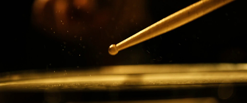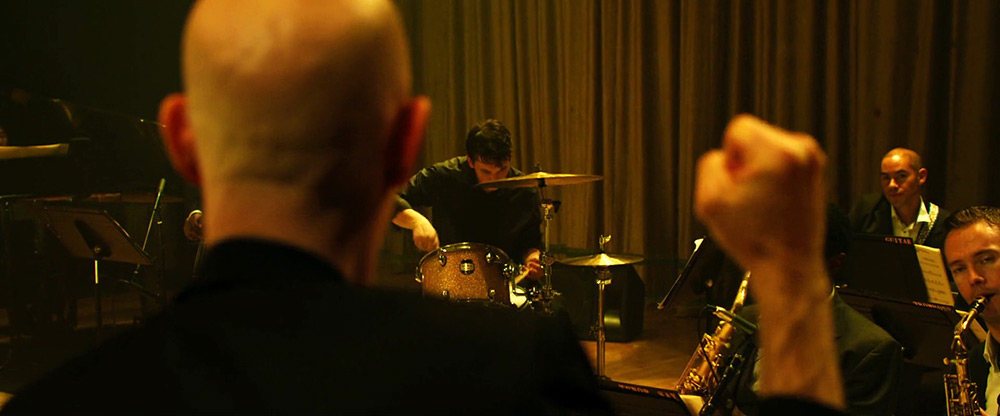 Andrews vilde solo markerer tredje og sidste runde, og her sætter han sig selv i dirigentrollen: ”I’ll cue you”, kommanderer han til Fletcher og kaster sig så ud i en præstation inspireret af Buddy Rich, Andrew’s store forbillede. I en central scene tidligere i filmen fortæller Fletcher ham om, hvordan Charlie Parker blev til Bird, den største jazzmusiker gennem tiden. I Fletchers version af historien kaster trommeslageren Jo Jones et bækken efter Parker, som næsten kapper hovedet af ham midt under en koncert. Et år senere vender Charlie Parker tilbage til scenen og leverer en legendarisk solo, der efter sigende aldrig er overgået. Det er den grundmyte om jazzen, der gentages i Whiplash. I øvelokalet har vi tidligere set Fletcher kaste en stol efter Andrew, som nu vender tilbage og leverer sin solo. Om den er så enestående rent teknisk, er ikke denne artikels ærinde at afgøre, men det er det indtryk man får godt hjulpet af den filmiske eksekvering. Andrew går nærmest i et med sit trommesæt, reallyden viger tilbage for en subjektiv lyd, de blødende hænder trommer i slow motion, og ultranærbilleder viser sveddråberne på Andrew’s øre. Selv trommesættets bækkener ser ud til at svede under kraftanstrengelsen.