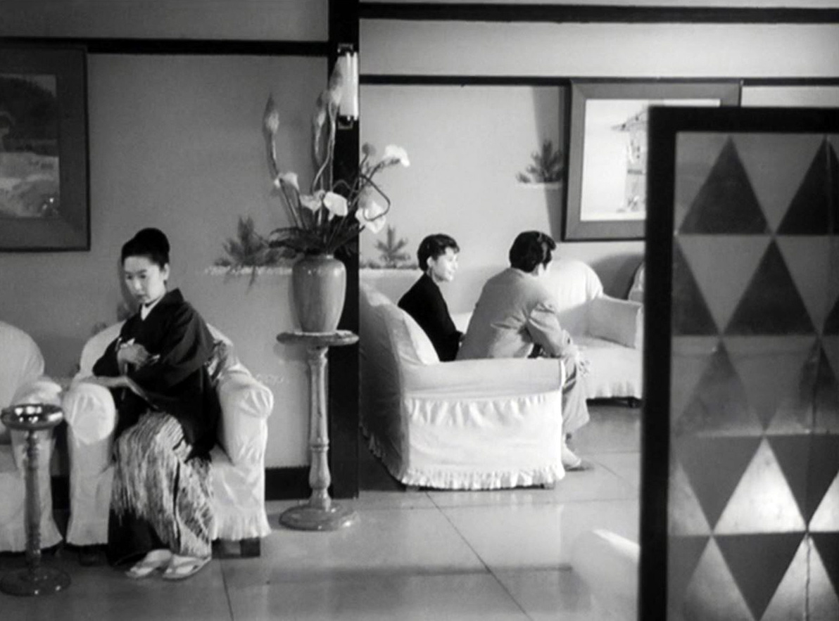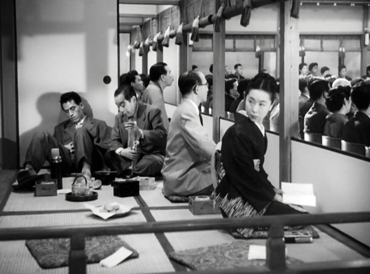 Upon receiving tickets to a noh performance from one of her patrons, Hatsuko, Matoba and Yukiko attend the theatre along with many of the customers from Izutsuya. Throughout the film, Matoba and Yukiko have become emotionally closer. Mizoguchi represents this in an understated manner. Although at this point Hatsuko is still oblivious to the feelings between the two, in a familiar example of dramatic irony, the audience is privileged in already knowing, hoping she will not discover their growing relationship. Mizoguchi here utilises the location for a moment of revelation and heartbreak to compose one of the most powerfully intense moments in any of his pictures.