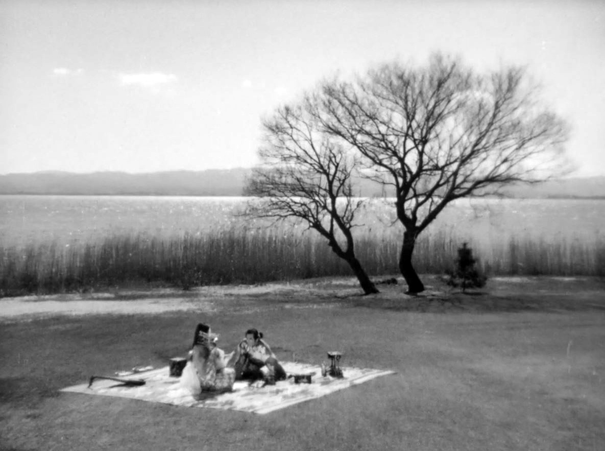 Wakasa is presented unlike any other character in the film. Apart from her stylised costume and otherworldly demeanour, she is also overtly sexual; siren-like, she entices Genjuro into her inner-sanctum. Praising the craftsmanship of his pottery-ware, she begins an elaborate seduction, displaying a submissive tendency whilst at the same time remaining in control; she is playing a game and Genjuro, blinded by her beauty, is oblivious to this. Wakasa then dances for Genjuro, slowly and sensuously (fig. 8). The song that she chants tells of the transience of mortal things and how the living body fades. This performance is heightened dramatically as darkness descends and we are confronted with a close-up of a samurai helmet. A deeper male voice joins in the chant in a tone of doom-laden foreboding. The descent of the spirit is confirmed in the form of Wakasa’s father, who announces his presence not through the beauty of the matsu tree but through an image of violence, a samurai helmet. Such subversion is also witnessed in the following scene. After Wakasa bathes Genjuro, the couple are laying together by Biwa Lake. Central in this extraordinarily deep shot are the inclusion of three bare and imposing trees (fig. 9). Serper notes the importance of the mise en scène here in its relationship to noh: