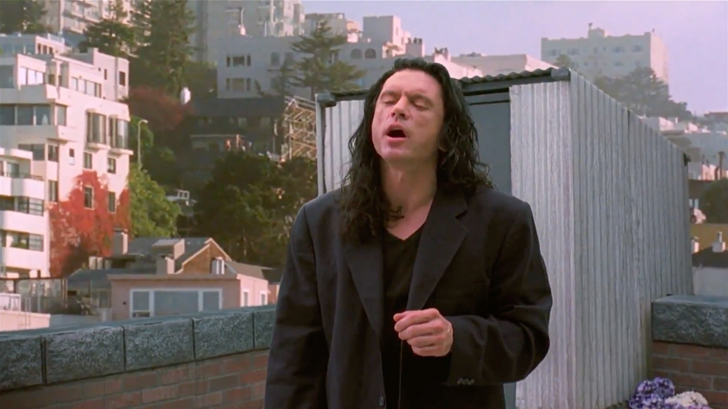 Such intricate Classical Hollywood norms as those dictating what amount of establishing shots are appropriate for a film, however, are not all that audiences have to agree on in order to enjoy The Room’s badness in the way that they do. Much of the film’s humor specifically stems from its violations of the central Classical Hollywood norm of realism, which Wiseau’s seemingly strange and eccentric view of the world makes him unable to adhere to. As Bissell puts it, The Room “is like a movie made by an alien who has never seen a movie but has had movies thoroughly explained to him” (2017). Characters’ behavior and dialogue are consistently so humorously off in the film that it manages to unite audiences in laughter at what they jointly consider inauthentic and unreal human behavior. Immediately after having been accused of domestic violence by his fiancé, for instance, Wiseau’s character Johnny storms onto the rooftop of his apartment building, angrily muttering to himself “I did not hit her, it’s not true! It’s bullshit! I did not hit her! I did not!”. Upon noticing his best friend Mark, however, his attitude suddenly changes completely as he greets him warmly with the words “Oh, hi Mark!” (fig. 8). Audiences, in turn, often honor this unrealistic mood change by greeting certain characters similarly when they enter a scene, saying “Oh, hi Johnny!” and the like (Ratcliff 2016).