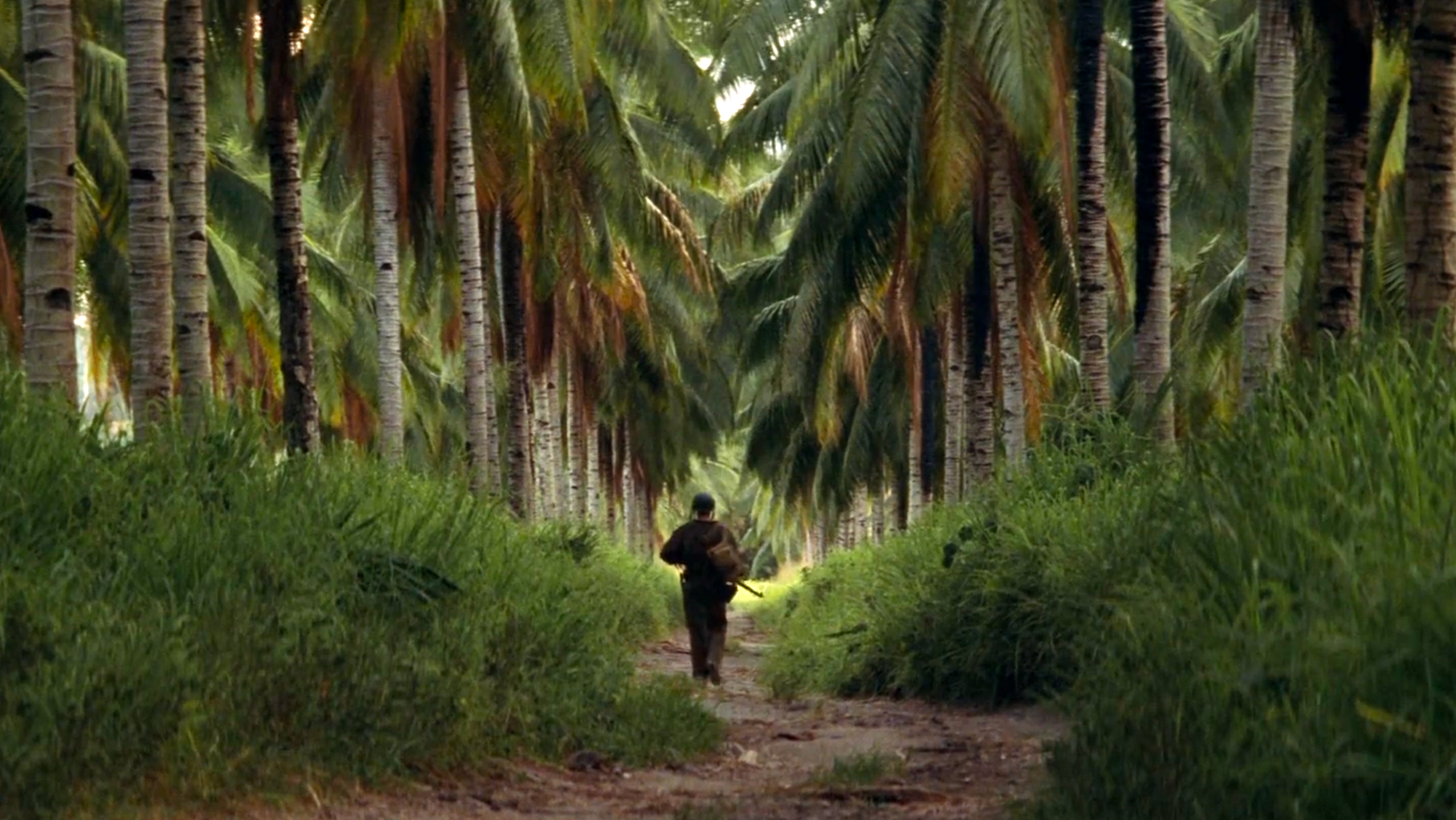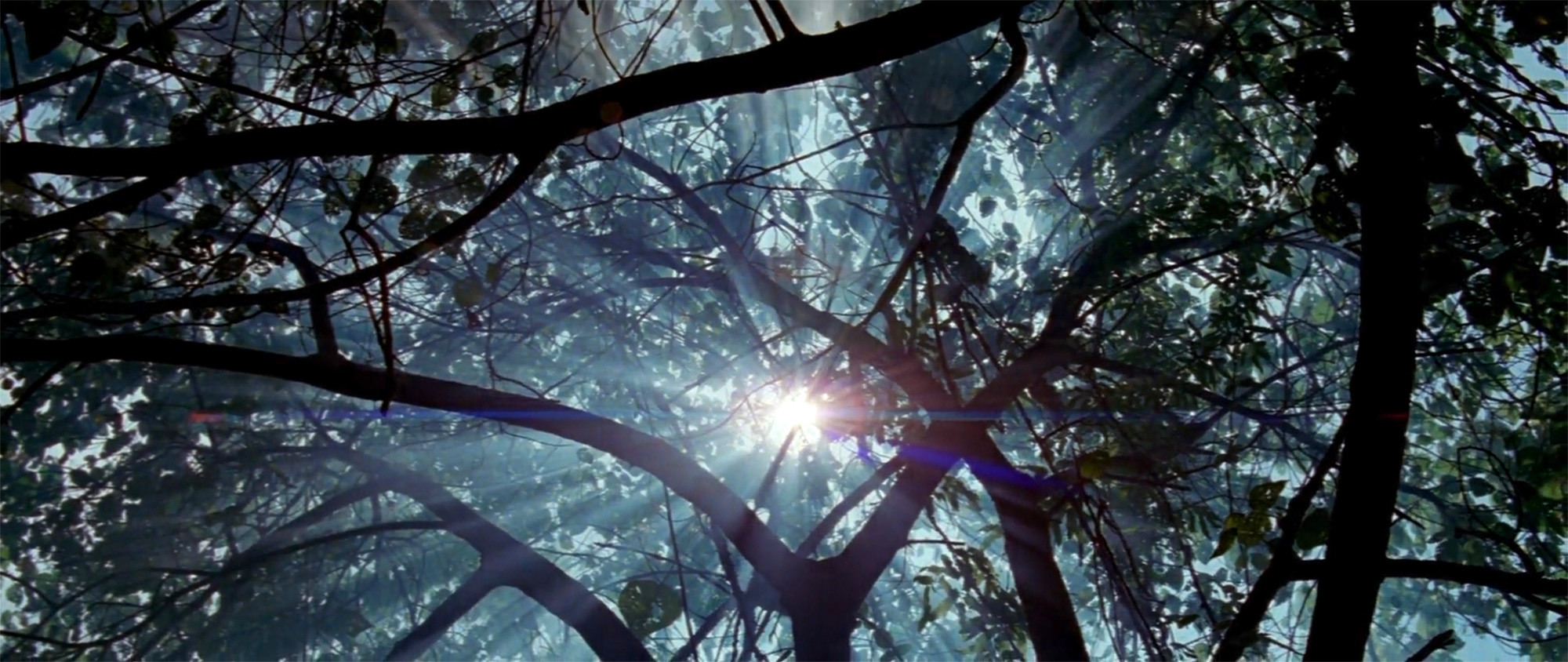 Selvom Malick præsenterer sine seere for et mørkt og blodigt verdensbillede, levner han alligevel en lille mulighed for at lyset kan trænge igennem Guadalcanal-junglens mørke trækroner – også bogstavelig talt (fig. 12).