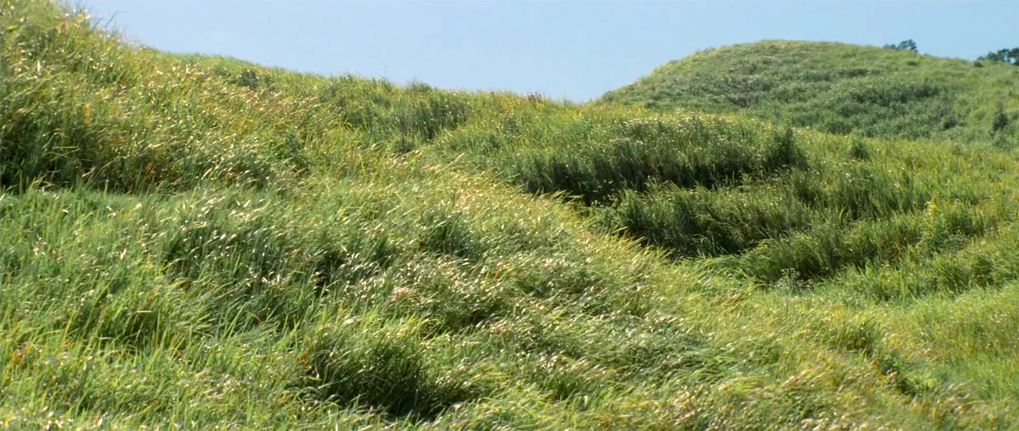 Naturen i filmen er også brutal, den tager sig ikke af de menneskelige rædsler, og billederne af naturen fungerer oftest hverken som establishing shots eller i relation til plottet. Naturen passer for det meste bare sig selv. Det understreges allerbedst i optakten til filmens første slag, hvor soldaterne gør klar til ild. Skyerne dækker for solen og omgivelserne er derfor mørke (fig. 8). To amerikanske soldater bliver skudt, og vi forventer nu det værste. Pludselig begynder solens stråler dog at oplyse græsmarken, som om faren er drevet over, men det er den langtfra. Krigen bryder nu ud, og vi må sande, at vi kan glemme alt om at aflæse filmens handlingsforløb ud fra naturens adfærd (fig. 9). Naturen er ligeglad.