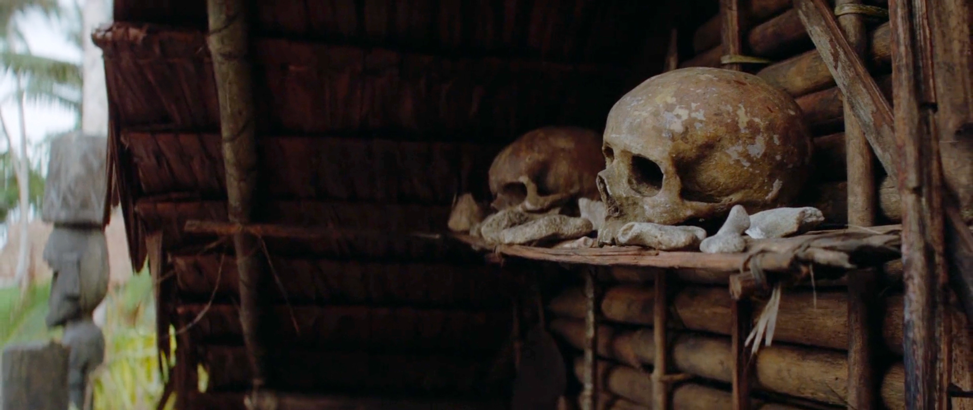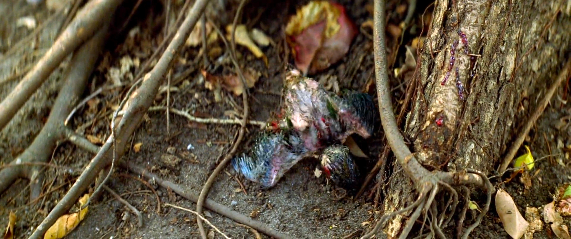 Det vrimler med disse naturbilleder, billeder af fugle, dyr, lianer, træer, græs og meget andet, som afviger fra krigen mellem de amerikanske soldaters kamp og de japanske styrker. Malicks film afmonterer imidlertid også idéen om, at det skulle være civilisationen, der bringer død og ødelæggelse ind i en harmonisk natur. Soldaten Witt (Jim Caviezel), der er stukket af fra tjeneste, befinder sig i filmens begyndelse blandt de indfødte på øen, i hvad der ligner en naturfolkelig idyl. Alle virker fornøjede og fredfulde. Da han kommer tilbage til øboerne i slutningen af filmen, er tonen dog en helt anden. Børnene er bange for Witt, og der klippes fra skærmydsler blandt de voksne øboere og hylder fyldt med menneskekranier (som tydeligvis ikke er nye) til Witt, som står forundret og betragter forandringerne (fig. 10). Intet tyder imidlertid på, at det er japanerne eller amerikanerne, der har forvandlet den lille landsby. Det er nærmere et tegn på, at Witts blik på eller forestillinger om øboerne har ændret sig siden sidst (Pippin 2013, 259). Ufreden eksisterer altså overalt i The Thin Red Line, især i naturen. I et andet, men ganske kortvarigt billede, oplever vi ligeledes, hvordan en fortabt fugleunge er på dødens rand, mens soldaterne kæmper løs (fig. 11). Det føles i hvert fald ofte som om, der overalt svæver en ustandselig vilje til liv rundt i filmen.