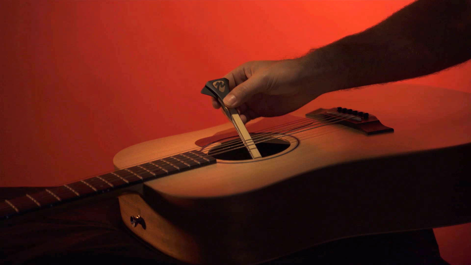 KEA: Det er noget jeg lige har skaffet. Jeg har aldrig set den før. Der er nogen der fremstiller dem i Holland. En almindelig bue kan gå rundt fordi den er rund, men hvis man bruger den på en guitar er det jo så alle strengene på samme tid, men med den her kan du tage én streng ad gangen. [KEA demonstrerer det]