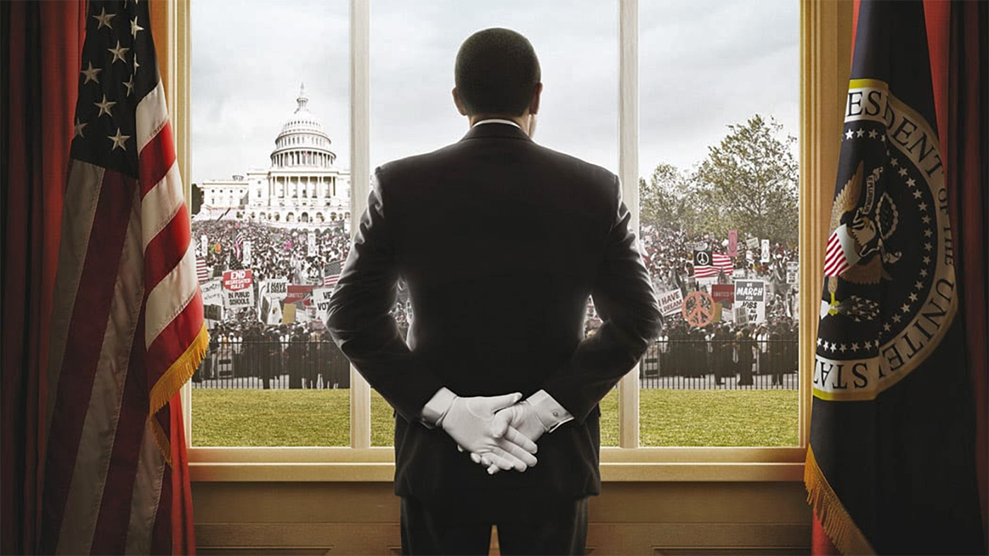 Filmens kobling til problemfilmen ses allerede af dens snedige plakat, hvor hovedpersonen (Cecil Gaines spillet af Forest Whitaker) ses som en silhuet med højre hånd selvsikkert hævet (i det der ligner en reference til De sorte pantere, men med en hvid tjenerhandske) og venstre hånd, der roligt og graciøst balancerer Det Hvide Hus på et sølvfad. Han er tjener – hvad traditionelt har været den sorte mands lod i USA – men holder USA’s fremtid i hånden (kunne det ligne en allusion til Obama?) og han rummer både den konsensuelle tjener og den aggressive oprører i én og samme person (jf. den hævede men hvidhandskede højre hånd) (jf. fig. 1).