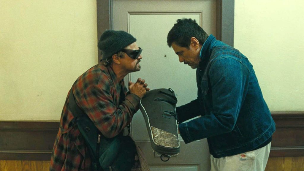 Benicio del Toro’s character Sensei Sergio St. Carlos (fig. 3) embodies this most of all: He is casually swept up in a futile revolution, which is not really a revolution but the quest of a desperate idiot to save his daughter. This is clearly not Sensei’s fight, yet he lends Bob his people’s resilience from 100+ years of fighting the system (the real revolution). Sensei is a bystander caught up in the actions of the white men, a classic western trope. The white men’s quest for their daughter – who is trying to escape both her spiritual and biological fathers – might, in this way, also be deserving of comparisons to The Searchers (Ford, 1956), in which John Wayne similarly attempts to harness a female relative on the run.