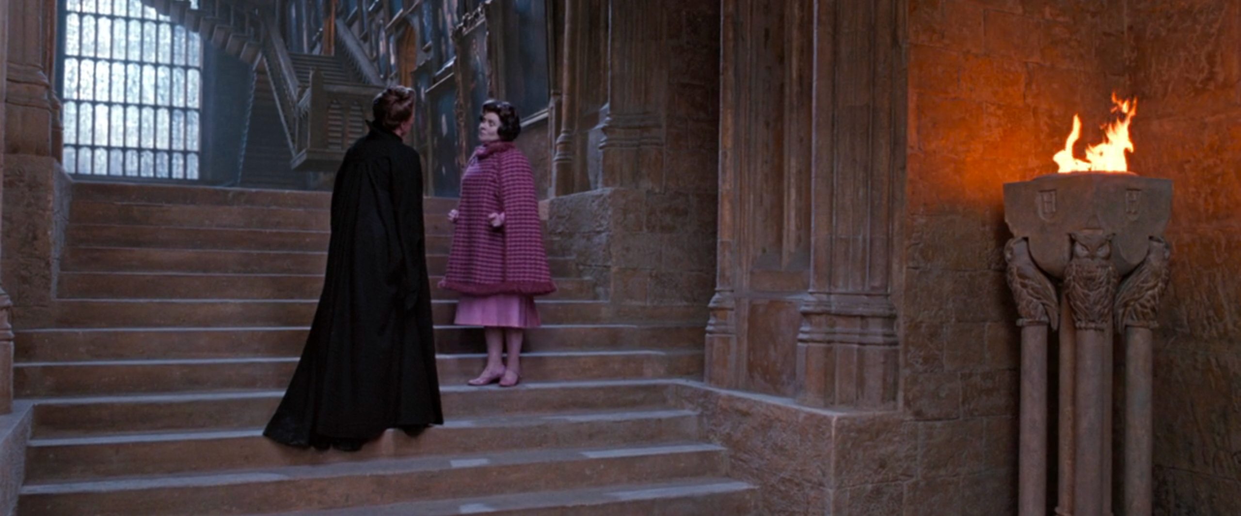 The characters’ relative placement to each other, both in the frame and on the physical set, is used to provide the audience with more information about the characters’ relationship and their mental state. Umbridge’s first step up the stairs is a clear indication of her trying to gain control of the situation, while McGonagall’s final step down marks her final defeat.